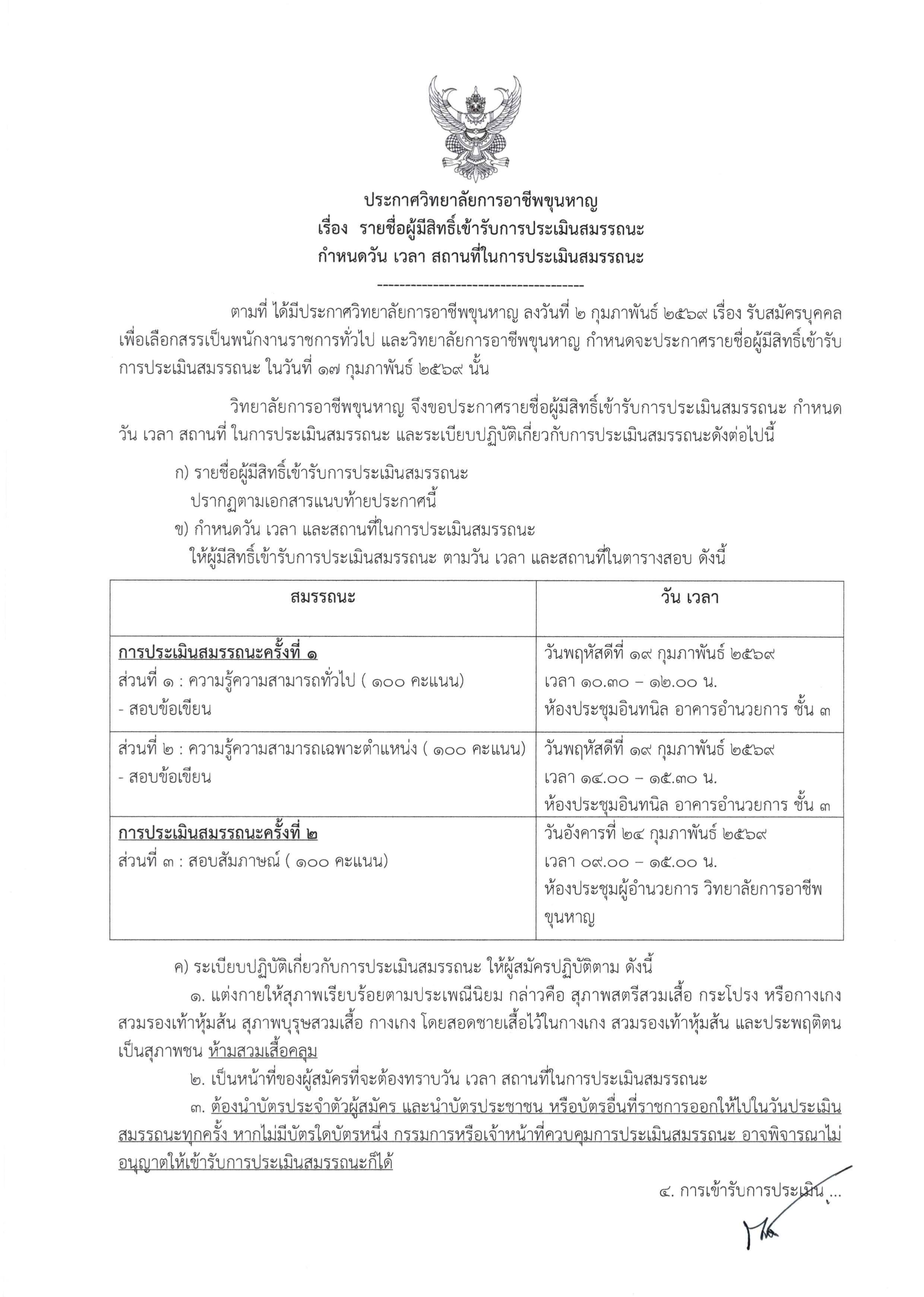 ประกาศวิทยาลัยการอาชีพขุนหาญ เรื่อง รายชื่อผู้มีสิทธิ์เข้ารับการประเมินสมรรถนะพนักงานราชการทั่วไป